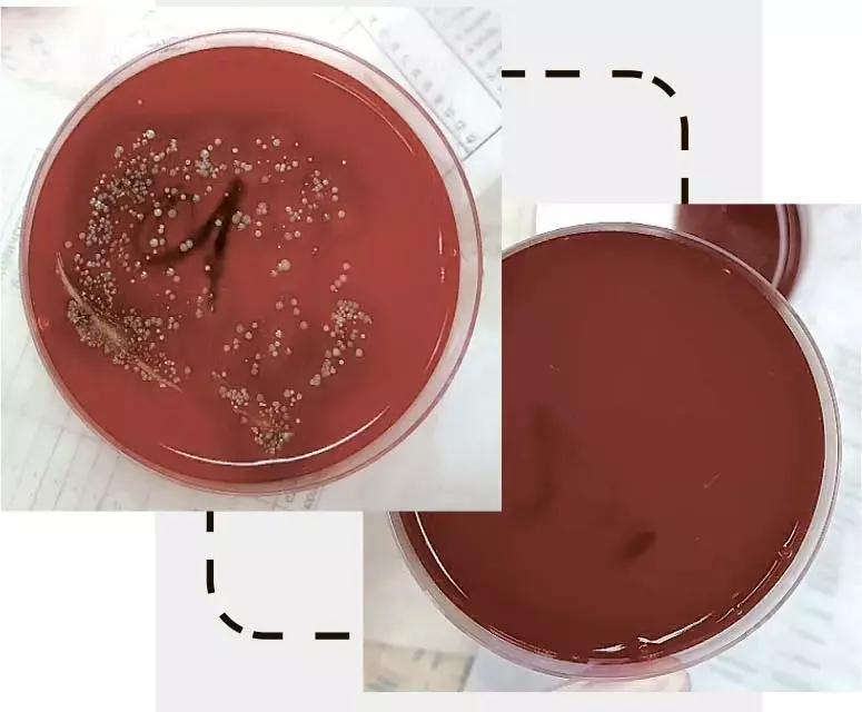 Рисунок 1. Результаты проведенных смывов с рук медицинского персонала методом отпечатков в рамках инфекционного контроля. слева — смывы, взятые до обработки рук антисептиком, справа — после обработки. Методика позволяет визуально оценить качество проведенной гигиенической обработки рук медицинским персоналом, а также выявить имеющиеся нарушения в технике данной процедуры.